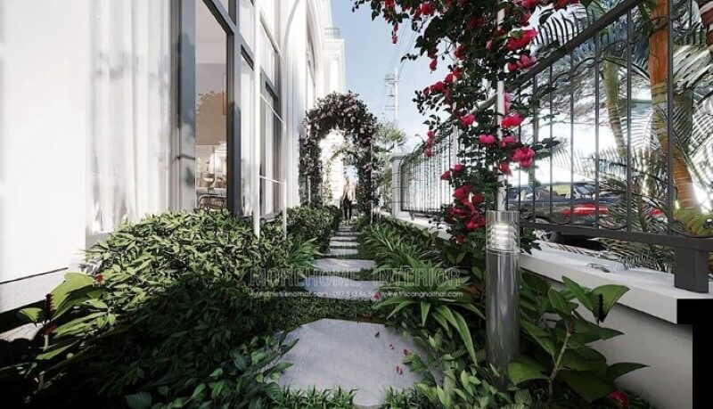 Ấn tượng với mẫu thiết kế lối đi hông nhà độc đáo, tinh tế với giàn hoa giấy khoe sắc hồng tươi tắn tô thêm vẻ đẹp quyến rũ cho biệt thự, nhà phố.