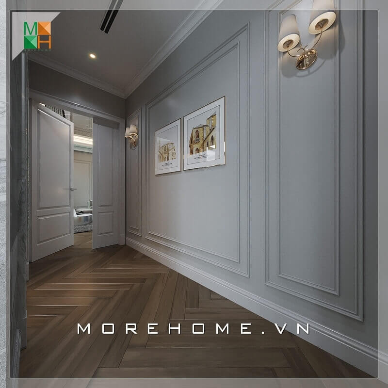 Không gian hành lang biệt thự, nhà phố đẹp với sàn gỗ cao cấp treo tranh nghệ thuật sang trọng.