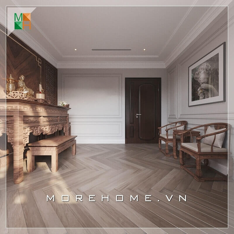 Thiết kế phòng thờ biệt thự, nhà phố ấm áp, gần gũi với việc bố trí nội thất gỗ óc chó cao cấp thể hiện lòng thành tâm của gia chủ.