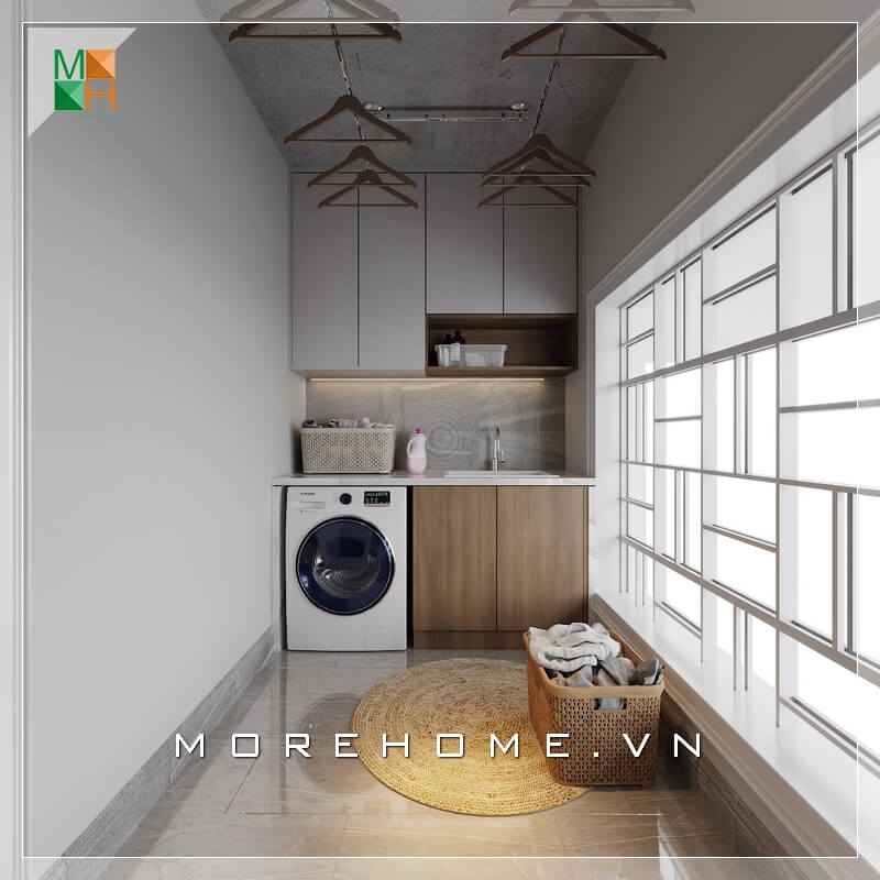 Nơi phơi đồ, giặt quần áo của biệt thự được thiết kế hiện đại với hệ thống tủ chứa gọn gàng, tiện nghi.