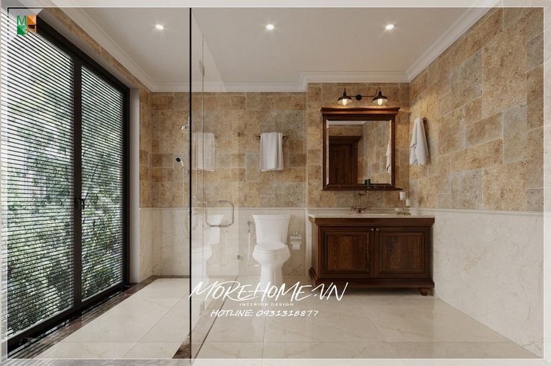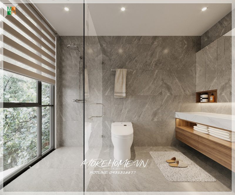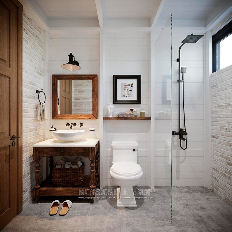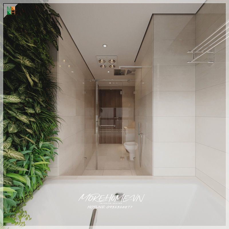 Vách tắm kính thông thoáng phân chia 2 khu vực phòng tắm đứng và khu vực khác trong phòng tránh gây ướt át khó chịu.