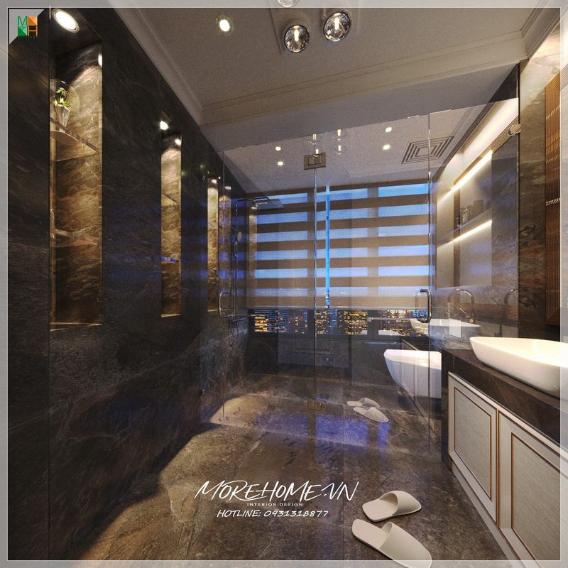 Trang trí phòng tắm chung cư với thiết bị vệ sinh hiện đại cùng gương trang trí,đá ốp tường, vách tắm kính