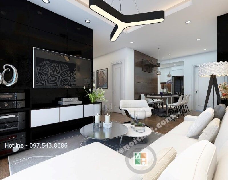 Thiết kế nội thất chung cư với nội thất phòng khách thiết kế hiện đại, sang trọng. Nội thất bố trí gọn gàng.