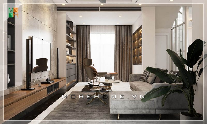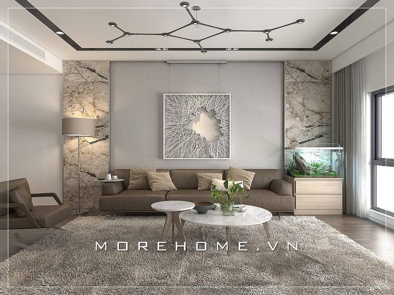 Phòng khách chung cư hiện đại được thiết kế theo gam màu nâu trầm trung tính, mang đến cảm giác bình yên nhẹ nhàng thư giãn đến lạ cho cả gia đình