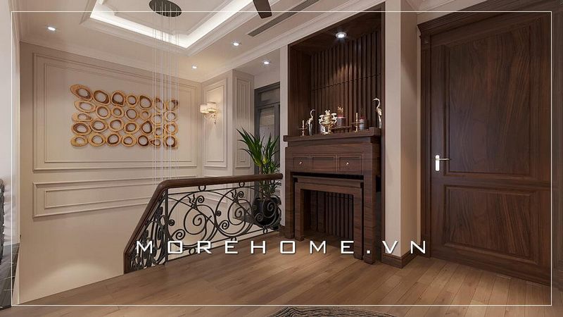 Mẫu bàn thờ đẹp biệt thự được đặt ở vị trí tầng 2, KTS đã khéo kéo thiết kế tường âm để tạo không gian riêng tư để bàn thờ với tường ốp gỗ mang đến vẻ đẹp sang trọng và cao cấp