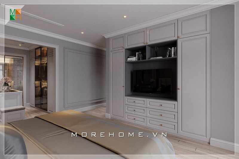 Ấn tượng với kệ tủ đồ gỗ kết hợp, thiết kế âm tường kịch sàn rất tiện lợi và phù hợp với không gian căn phòng ngủ chung cư, nhà phố.