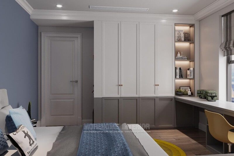 Tủ quần áo kết hợp kệ trang trí sơn trắng tay nắm đẹp, sang trọng cho phòng ngủ cho bé phong cách tân cổ điển