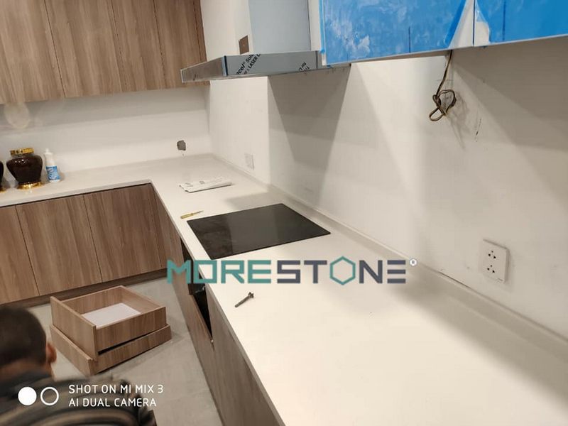 Chiêm ngưỡng mẫu thi công nội thất bếp đá ốp Himacs màu trắng cao cấp sang trọng cho biệt thự, nhà phố, chung cư.