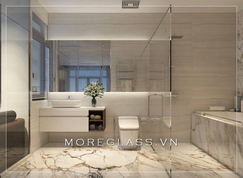 Vách tắm kính 180 độ ngăn giữa 2 không gian ướt và khô tránh văng nước gây ướt át khó chịu.