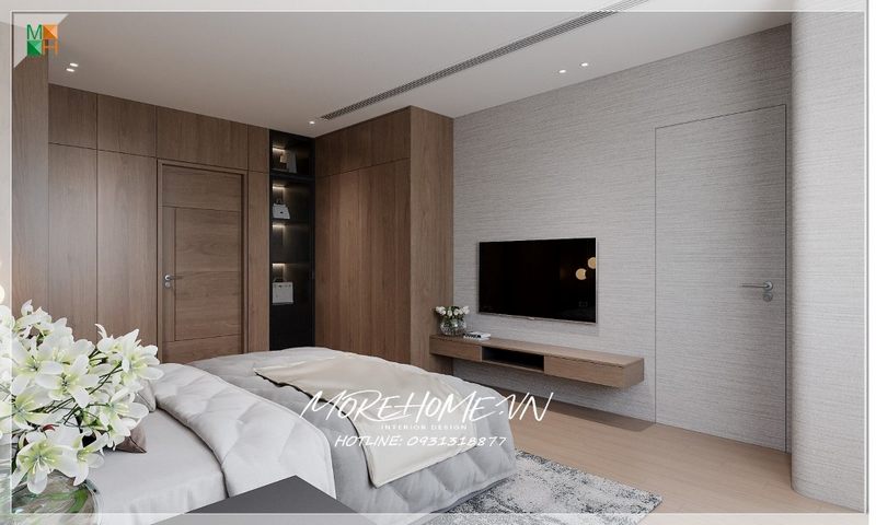 Phòng ngủ chung cư được thiết kế với tone màu ấm cúng, những vật dụng nội thất được thiết kế với đèn nét đơn giản sang trọng, những điểm nhấn nối bật được KTS đưa vào những đồ dùng trang trí như tranh và bình hoa