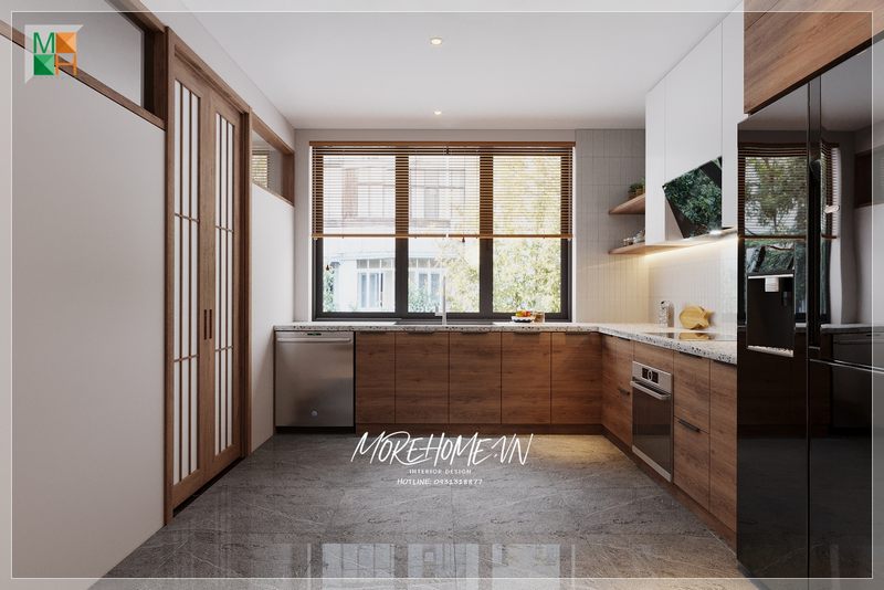 Thiết kế không gian phòng bếp nhà phố hiện đại với nội thất bếp gỗ công nghiệp đơn giản, tiện nghi cho người nội trợ