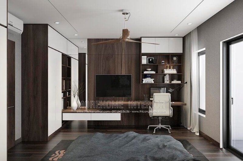 Kệ tivi liền bàn học độc đáo cho phòng ngủ hiện đại.