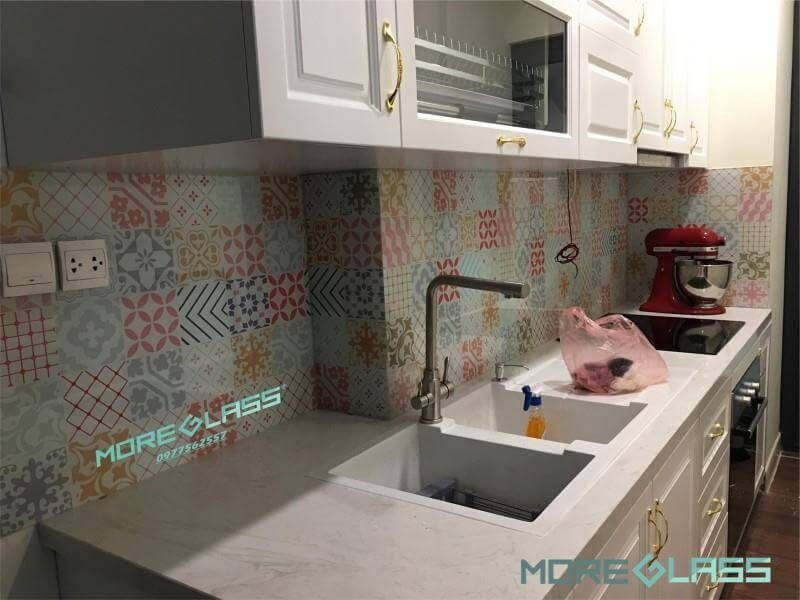 Mẫu tủ bếp An Cường được làm từ gỗ công nghiệp chống ấm, mặt bếp được ốp bằng đá nhân tạo vân mây cao cấp và kính ốp bếp họa tiết Mosaic tạo nên hiệu ứng thị giác lạ mắt, gây ấn tượng mạnh mẽ.