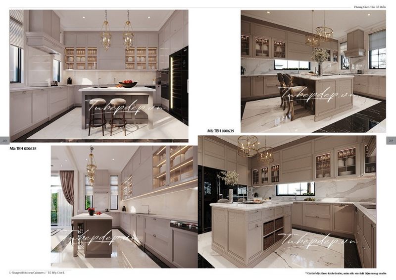 Ngắm nhìn mẫu thiết kế nội thất bếp cổ điển với kiểu dáng chữ L sang trọng, bắt mắt và được trang bị tiện nghi phù hợp với không gian bếp của căn hộ, nhà phố, biệt thự.