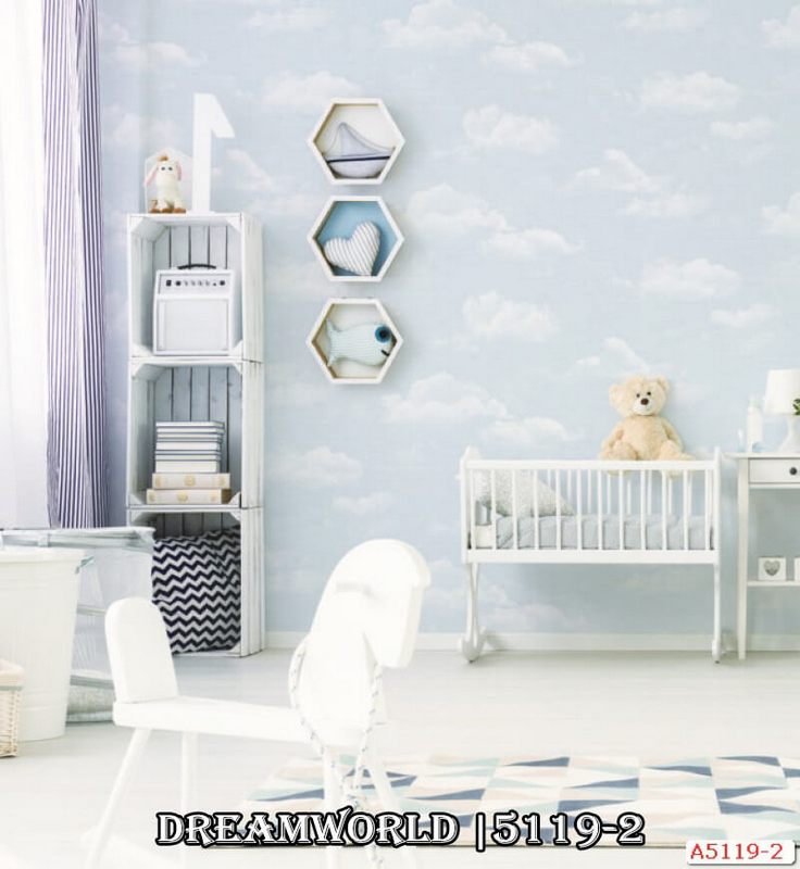 Không gian trẻ em mới, đầy màu sắc và tràn ngập sắc xanh, được tạo nên bởi mẫu giấy dán tường cao cấp Hàn Quốc vân mây 5119-2.